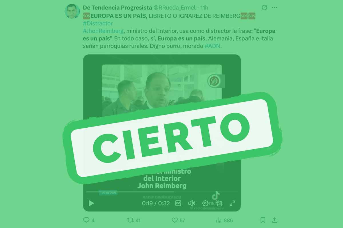 - Qué verificamos: Una declaración del ministro del Interior, John Reimberg, difundida en redes sociales como burla, en la que afirma que “Europa es un país aliado del Ecuador”.