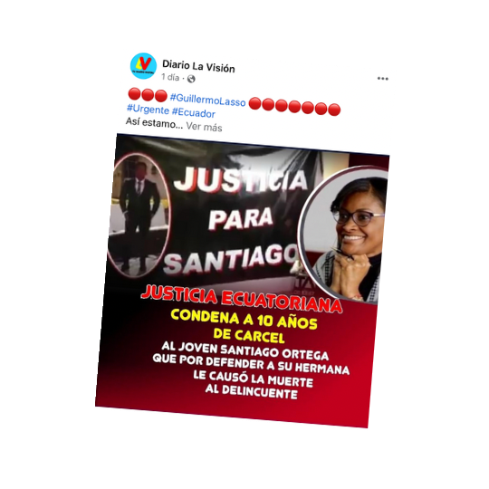En Facebook se publicó un contenido que asegura que la justicia ecuatoriana condenó a 10 años de cárcel a un joven que, por defender a su hermana, le ocasionó la muerte a un delincuente. El hecho es cierto, pero calificamos este post como impreciso porque la composición, que incluye el rostro de la Fiscal General y frases como “¡Así estamos!”, tiene una clara carga política.