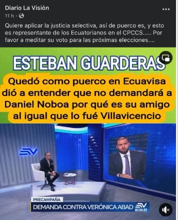 Una publicación en Facebook, justamente, se vale de este tema para difundir desinformación. Con un clip de video de una entrevista del consejero Guarderas, en Ecuavisa,asegura que el funcionario quedó mal en Ecuavisa y “dio a entender que no demandará al presidente, Daniel Noboa, porque es su amigo al igual que lo fue el excandidato Fernando Villavicencio”. Calificamos este contenido como engañoso. Si bien el post ocupa un clip real de Guarderas, extraído de una entrevista con el medio, la frase está sacada de contexto. En una rueda de prensa el consejero dijo que no descarta enjuiciar al presidente Noboa.