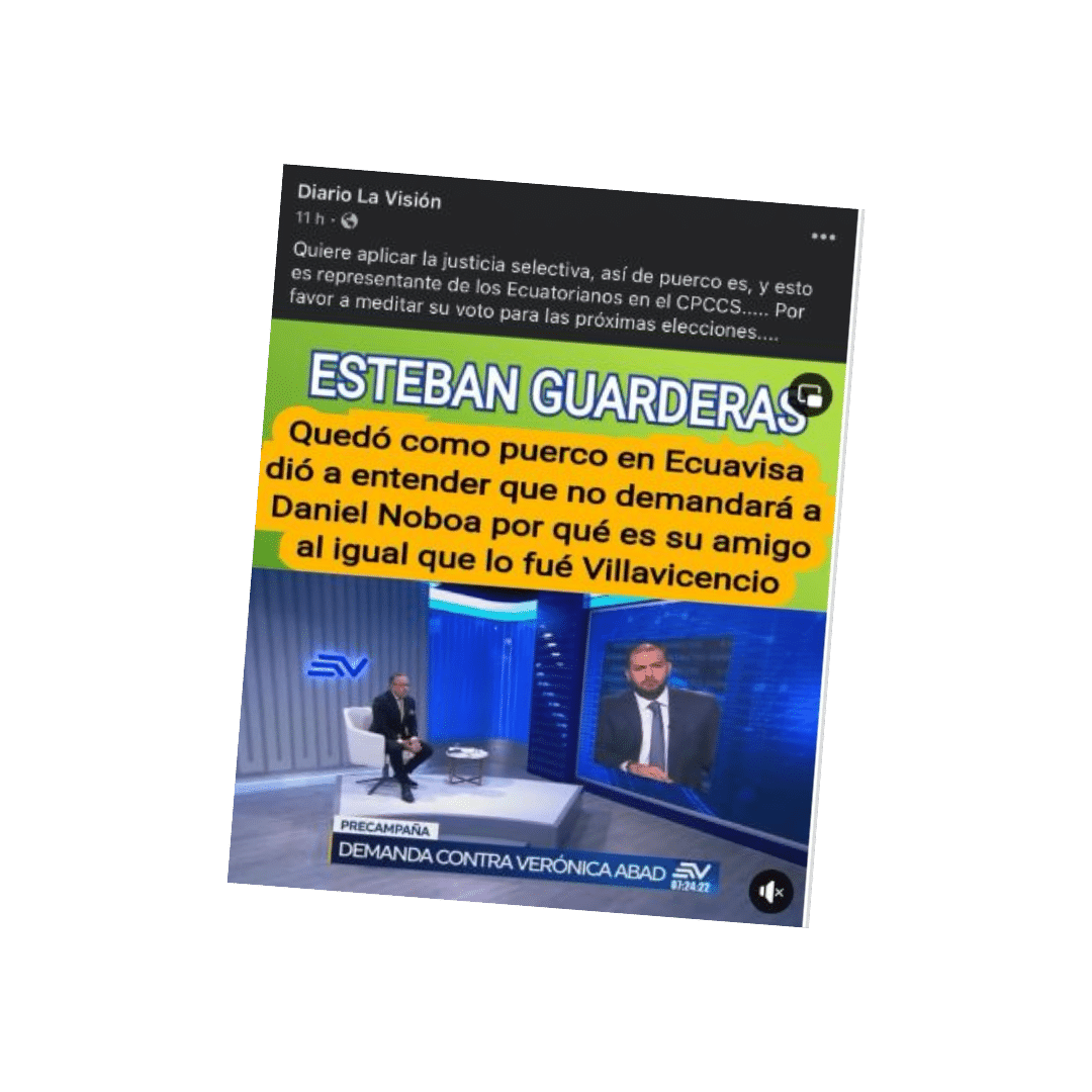 Una publicación en Facebook, justamente, se vale de este tema para difundir desinformación. Con un clip de video de una entrevista del consejero Guarderas, en Ecuavisa,asegura que el funcionario quedó mal en Ecuavisa y “dio a entender que no demandará al presidente, Daniel Noboa, porque es su amigo al igual que lo fue el excandidato Fernando Villavicencio”. Calificamos este contenido como engañoso. Si bien el post ocupa un clip real de Guarderas, extraído de una entrevista con el medio, la frase está sacada de contexto. En una rueda de prensa el consejero dijo que no descarta enjuiciar al presidente Noboa.