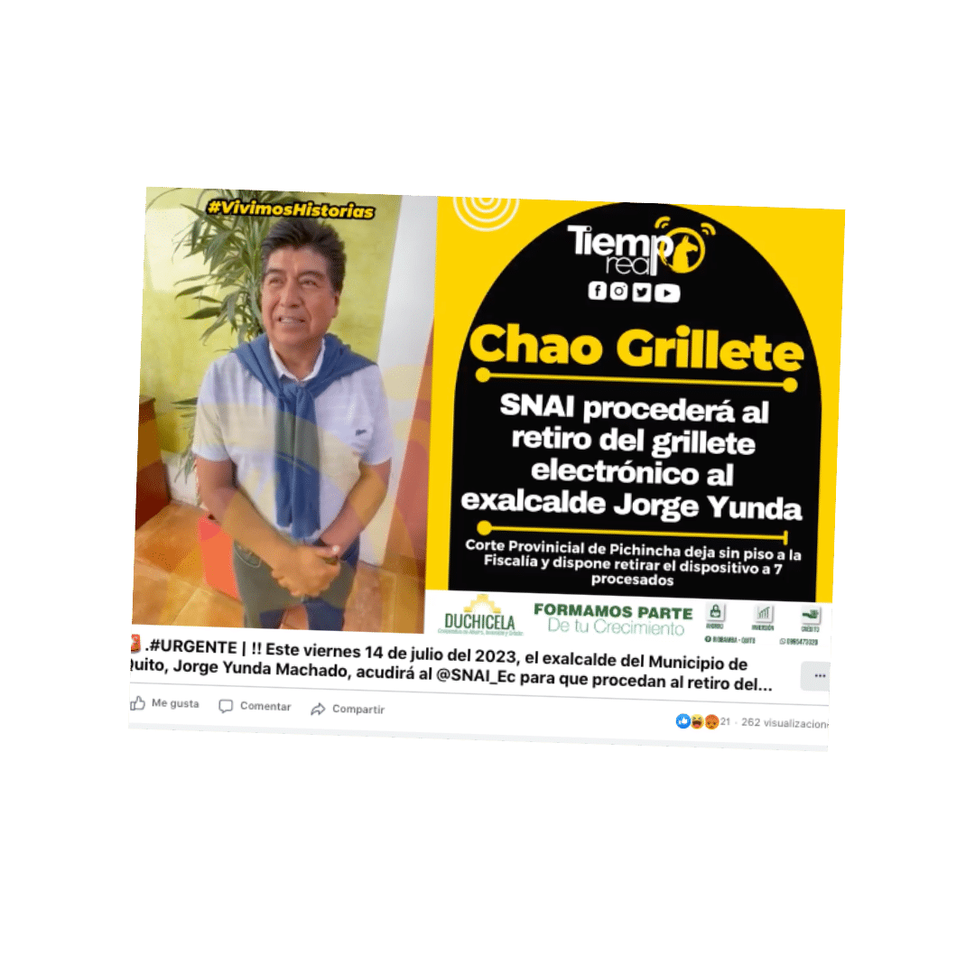 Este es el caso de una publicación realizada por la página de Facebook Tiempo Real. Esta asegura que la Corte Provincial de Pichincha dejó sin piso a la Fiscalía en el proceso penal que se sigue contra el exalcalde de Quito, Jorge Yunda, y otros seis procesados, por la compra de pruebas PCR en Quito. Esto, luego de que se ordenara retirar el grillete electrónico a los implicados en el caso.