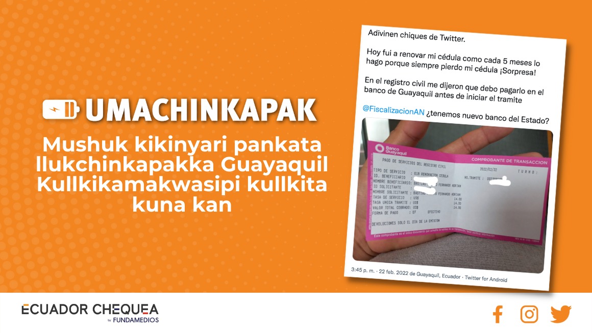 Guayaquilmanta Registro Civilka Municipiopa kamaywasi kan, chaymantami ima ruraykunata rurashpa, mushuk kikinyari pankata llukchinkapakka, Guayaquil Kullkikamakwasipimi kullkita kuna kan. Shinapash kayka mana mushuk ruray kanchu.