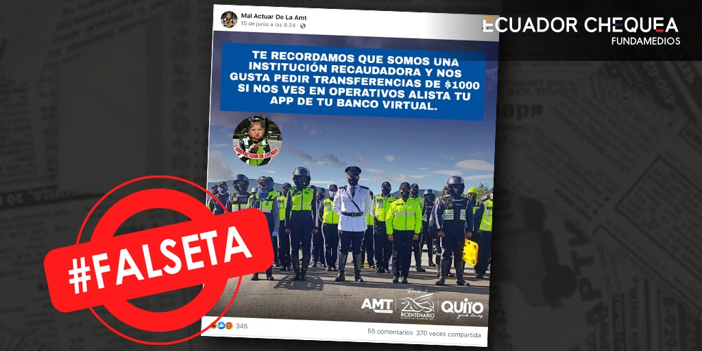 En la página de Facebook llamada Mal Actuar de la AMT, se publicó un contenido, el 15 de junio de 2021, que asegura “te recordamos que somos una institución recaudadora y nos gusta pedir transferencias de $1.000, si nos ves en operativos alista tu app de tu banco virtual”. La publicación hace referencia a la Agencia Metropolitana de Tránsito (AMT). La información es falsa.
