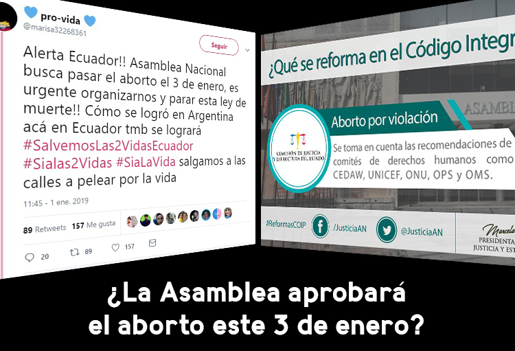 No. La Asamblea Nacional no aprobará este jueves 3 de enero la legalización del aborto, tal como se difunde erróneamente a través de redes sociales. La Comisión de Justicia anunció el 1 de enero de 2019 que hoy se tratará un conjunto de reformas al Código Orgánico Integral Penal (COIP): aborto por violación, maltrato animal, uso del cannabis con fines medicinales, entre otros.
