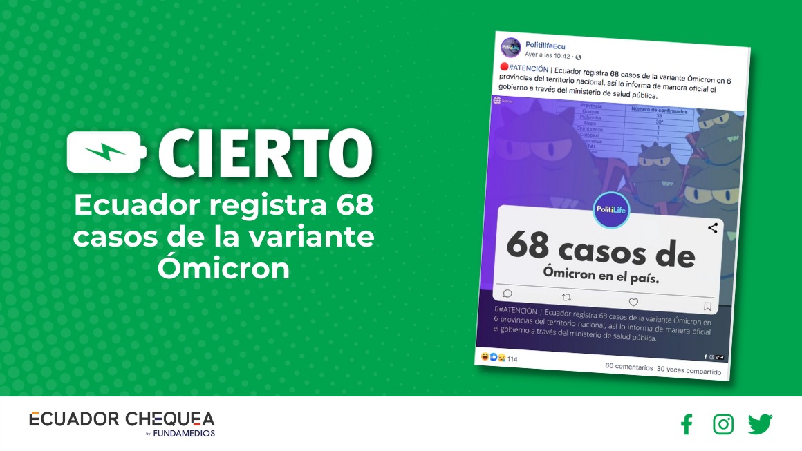 En Facebook se publicó un contenido que asegura que Ecuador registra 68 casos de la variante Ómicron y que se encuentra en 6 provincias a nivel nacional. La información es cierta.