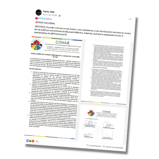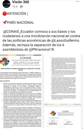 La Confederación de Nacionalidades Indígenas (Conaie) se mantiene en la oposición. Con esta información, una página de Facebook publicó que la Conaie convocó a un paro nacional y movilización en contra de las políticas económicas de Lasso. Esto es impreciso. La movilización nacional no es lo mismo que un paro. Además, sí hay una convocatoria a movilización, pero no existe una fecha concreta.