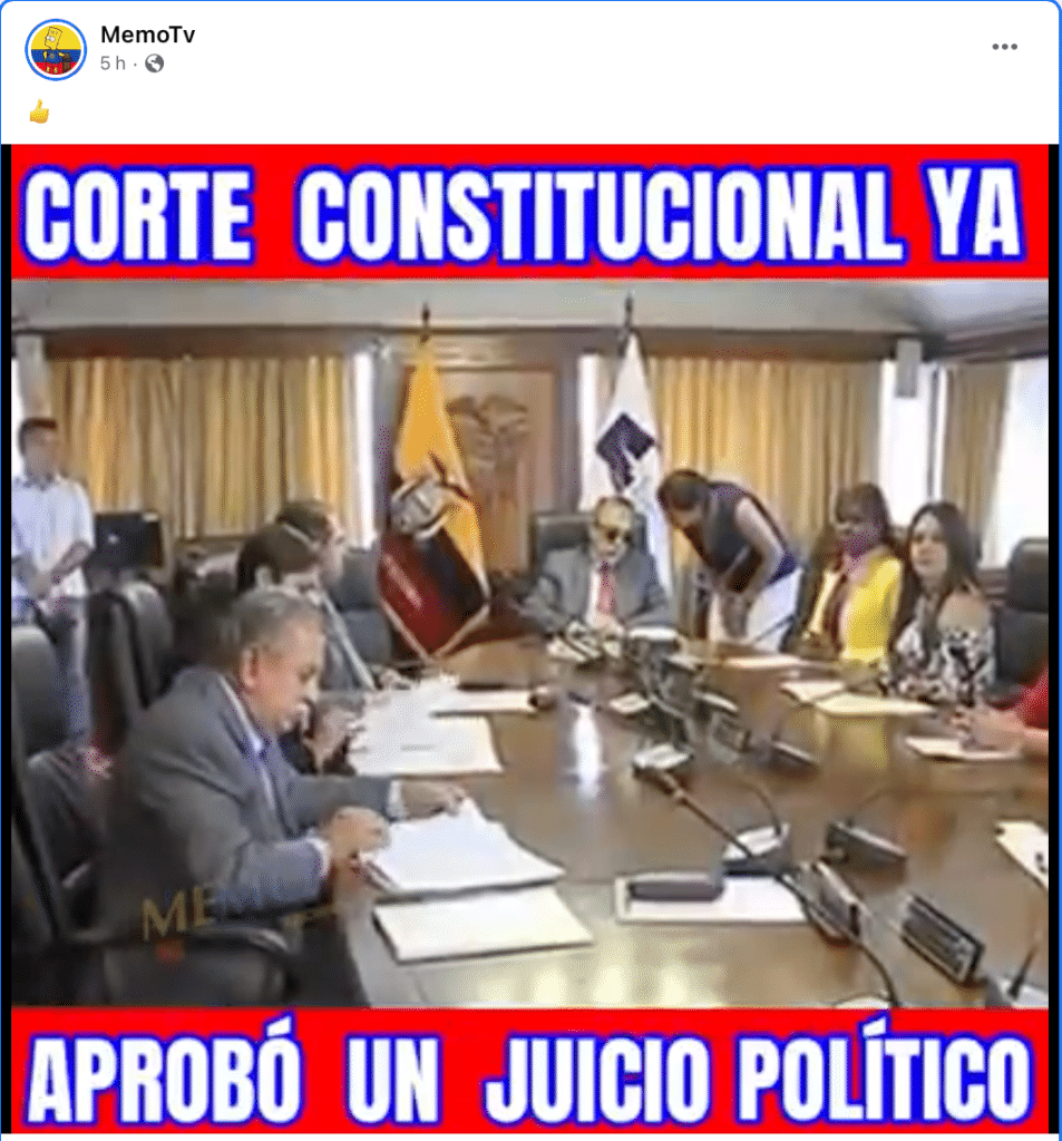 En el contexto del eventual juicio político al que se podría enfrentar el presidente, Guillermo Lasso, en una publicación de Facebook se asegura que en el pasado la Corte Constitucional ya admitió una solicitud de juicio político, refiriéndose al proceso del 2017 contra el exvicepresidente Jorge Glass. Este post sugiere que, con ese precedente, la Corte también debería admitir la solicitud que busca enjuiciar a Lasso. Calificamos esta publicación como imprecisa. Aunque es cierto que la Corte admitió ese proceso contra Glas, eso no obliga a la Corte a aprobar el caso contra Lasso, ni significa que vaya a hacerlo. Además, entre un caso y el otro, hay diferencias.