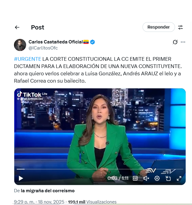 Un post en X asegura que la Corte Constitucional emitió el «primer dictamen» para iniciar la elaboración de una nueva Constitución mediante una Asamblea Constituyente. El contenido se acompaña de un video para reforzar la idea de que el proceso ya estaría en marcha.