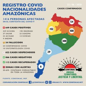 Ecuador registró 649 casos y 34 fallecidos en comunidades kichwa, waorani, shuar, achuar, waorani, siekopai, shiwiar, andwa, de acuerdo a la información de la Confederación de Nacionalidades Indígenas de la Amazonía ecuatoriana (Confenaie).