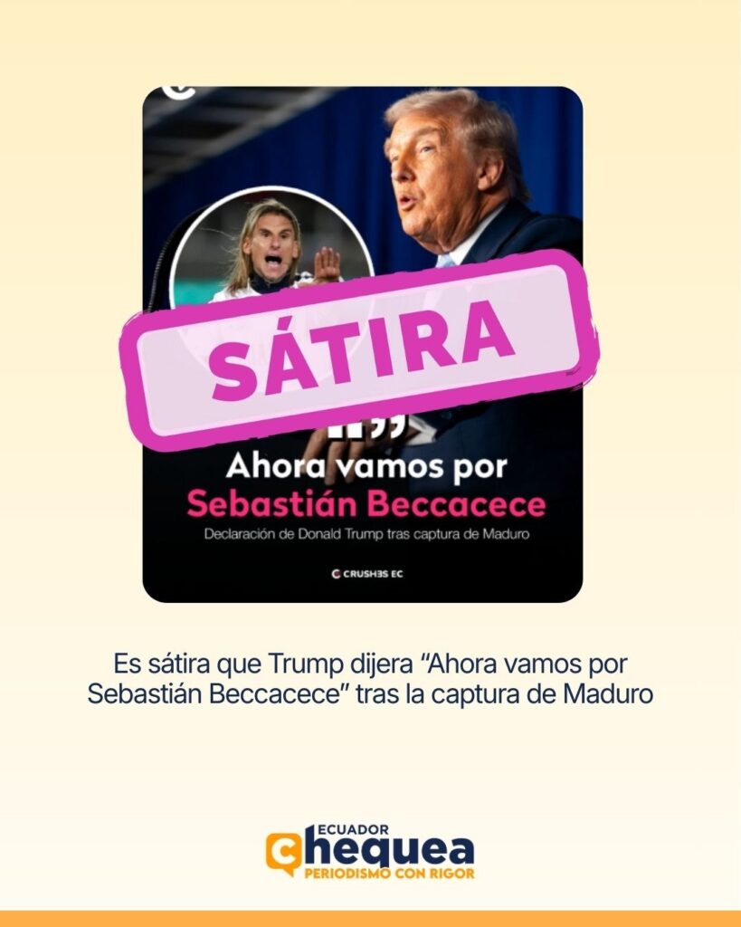 Circula una pieza gráfica con la imagen de Donald Trump y un recuadro con Sebastián Beccacece, acompañada de la frase “Ahora vamos por Sebastián Beccacece” y el texto “Declaración de Donald Trump tras captura de Maduro”. La pieza está firmada por “CRUSH3S EC”.