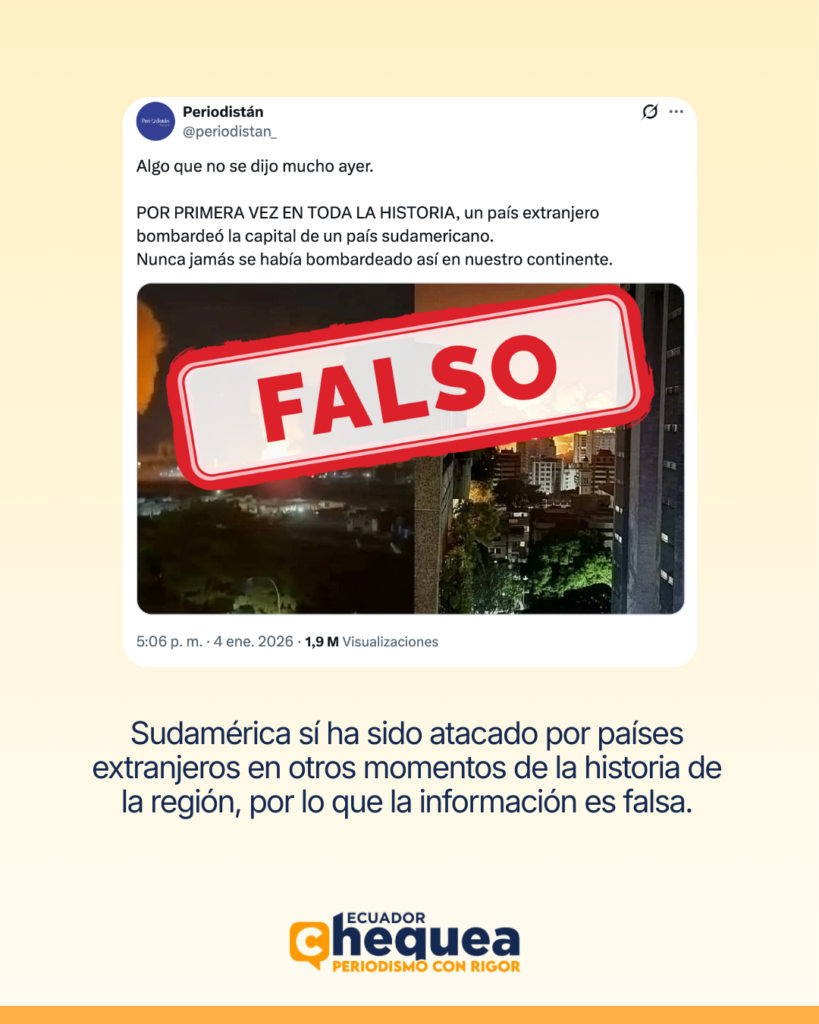 Es falso que sea la primera vez en la historia que un país extra-continental ataca o bombardea una ciudad en Sudamérica. Hay antecedentes verificables previos. Por tanto, el post presenta el hecho como inédito sin sustento histórico.