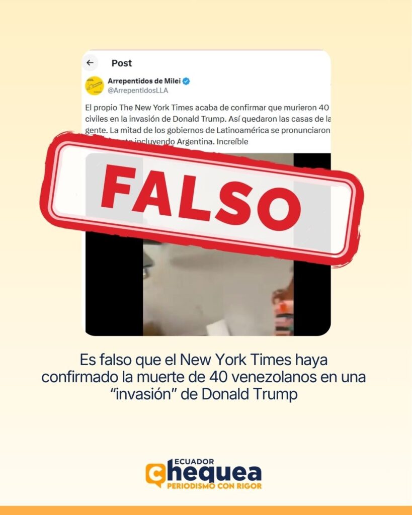 Un post en X afirma que The New York Times confirmó la muerte de 40 venezolanos durante una supuesta “invasión” ordenada por Donald Trump y acompaña la afirmación con un video de viviendas destruidas.