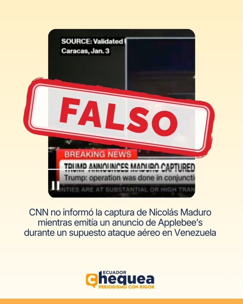 No existe ninguna evidencia de que mientras CNN reportaba la captura de Maduro, se compartió publicidad. La manipulación del video, la ausencia de trazabilidad y el uso de un hecho antiguo para construir una narrativa actual inexistente confirman que se trata de un contenido desinformativo.