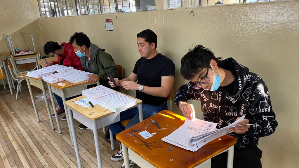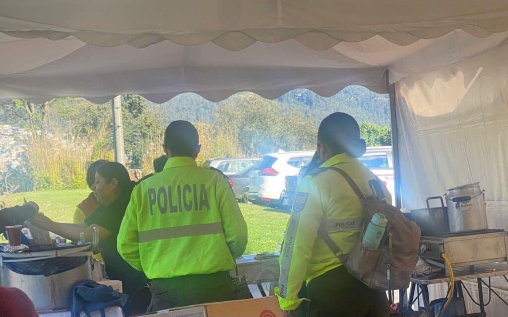 Con similar aspiración de que se garantice la paz y que la jornada transcurra con orden, un grupo de policías del Sistema ECU-911, se sentaron por apenas un par de minutos en el interior de una carpa de venta de morochos con empanadas, improvisada junto al recinto electoral del Colegio Santiago de Guayaquil, en la loma del Itichimbía, en el centro norte de Quito.