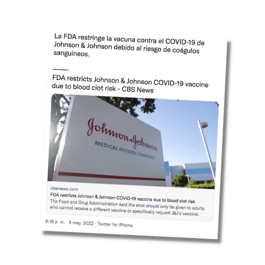 En Twitter se publicó un contenido que asegura que la Administración de Alimentos y Medicamentos (FDA, por sus siglas en inglés) restringe la vacuna contra el Covid-19 de Johnson & Johnson debido al riesgo de coágulos sanguíneos. La información es cierta.