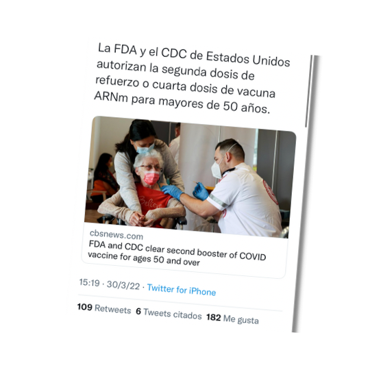 Una publicación en Twitter asegura que la Administración de Alimentos y Medicamentos (FDA, por sus siglas en inglés) y los Centros de Control y Enfermedades (CDC, por sus siglas en inglés) de Estados Unidos autorizan la segunda dosis de refuerzo —o cuarta dosis de vacuna ARNm— para mayores de 50 años. La información es imprecisa, ya que, si bien la FDA autorizó la segunda dosis de refuerzo, los CDC sólo dieron una recomendación para que algunas personas reciban dos dosis de refuerzo.