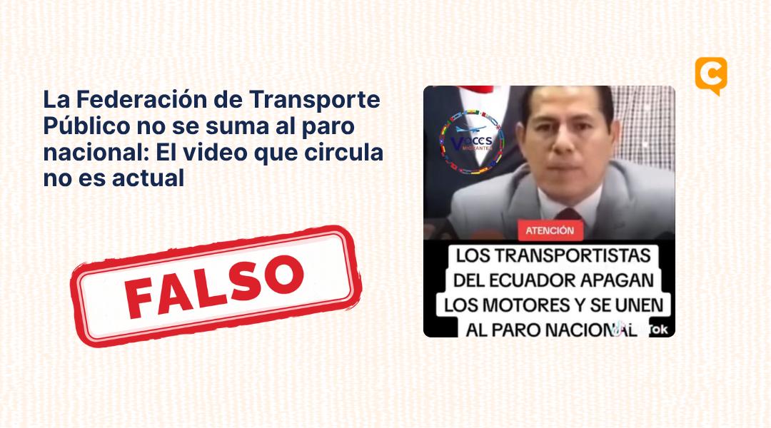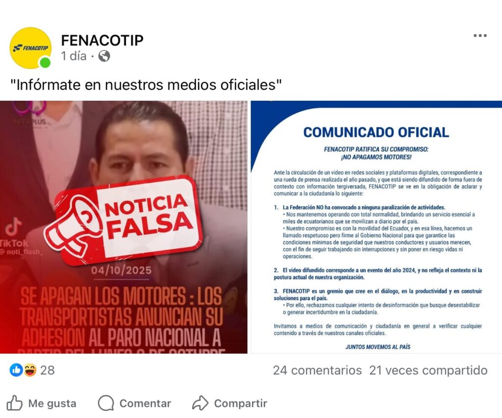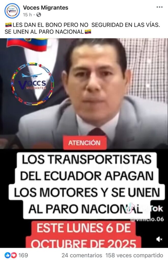 Una cuenta en Facebook denominada ‘Voces Migrantes’ compartió ayer el video, cuya duración es de 19 segundos. El contenido ha sido reproducido 8.000 veces y compartido más de 100 veces, colocando como evidencia un audio de Miguel Bonilla, representante de la Fenacotip, en el que anunciaba que el gremio decidió “apagar los motores”, haciendo creer que se sumarán a las movilizaciones.