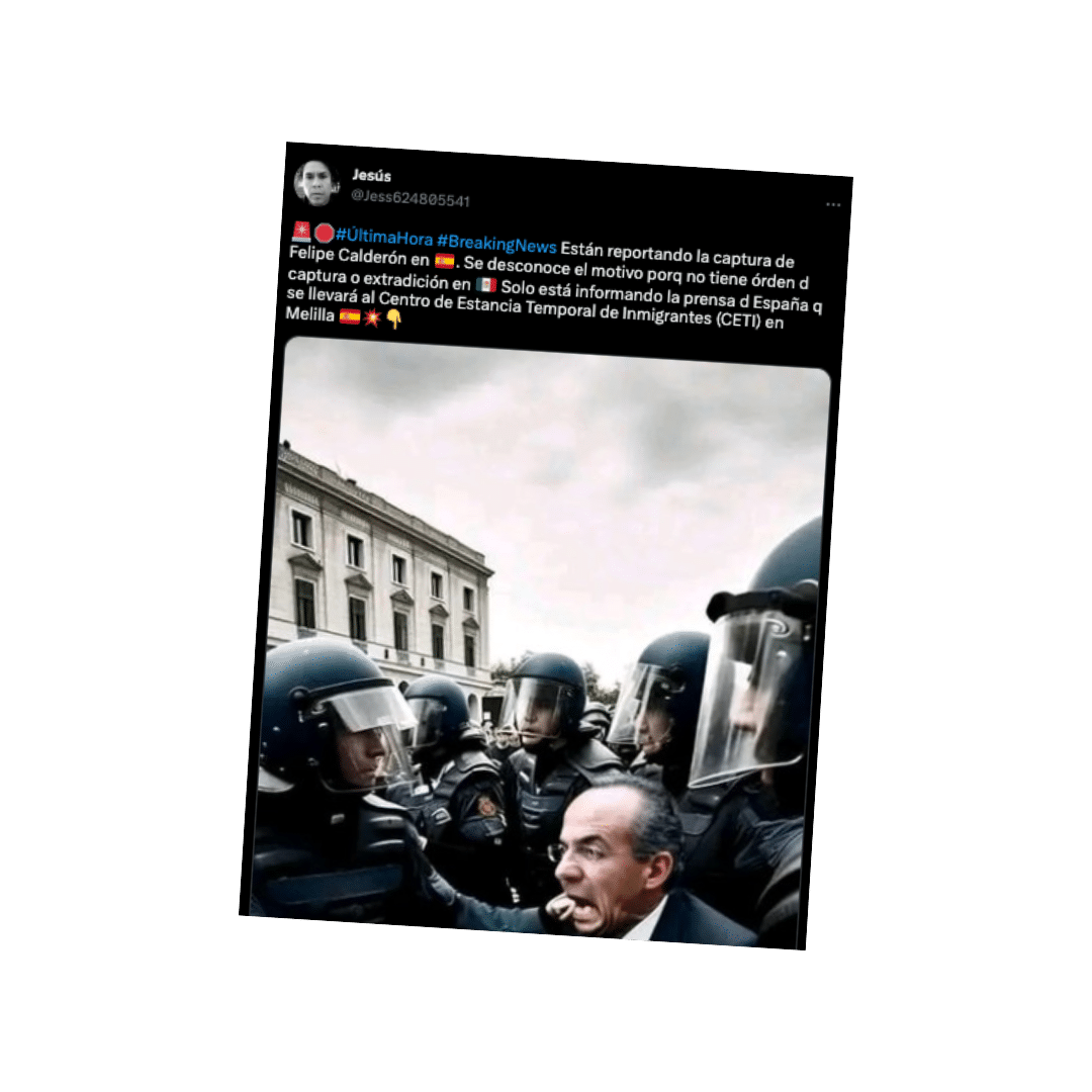 El 10 de abril, en Twitter se publicó una imagen en la que se asegura que reportan la captura del expresidente de México, Felipe Calderón y que se lo llevará al Centro de Estancia Temporal de Inmigrantes (CETI). Calificamos este contenido como falso. La imagen fue generada por inteligencia artificial (IA).