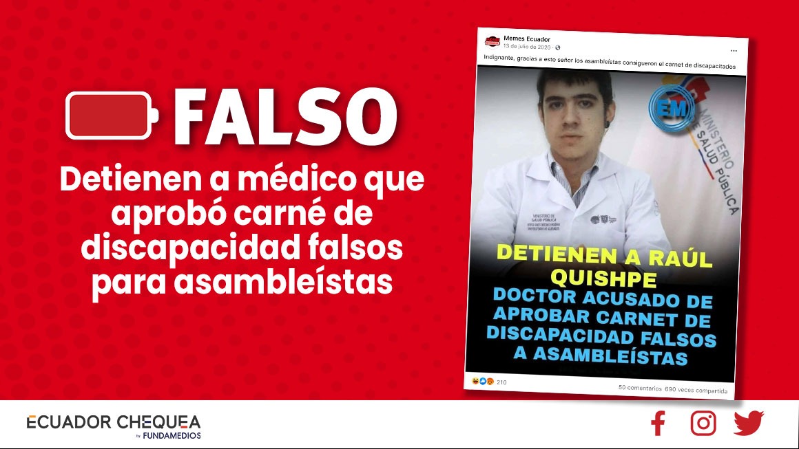 A través de la cuenta de Facebook Memes Ecuador difundieron la imagen de una persona con bata de médico del Ministerio de Salud de Ecuador donde se asegura: “detienen a Raúl Quishpe, doctor acusado de aprobar carné de discapacidad falsos a asambleístas”. La información es falsa y la gráfica es un montaje con la cara del youtuber español Auronplay.