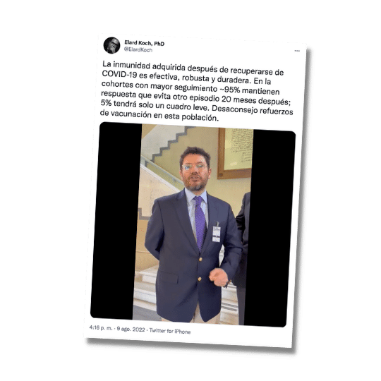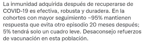 En Twitter se publicó un contenido que asegura que la inmunidad adquirida después de recuperarse de Covid-19 es efectiva, robusta y duradera. Y por esa razón, se desaconseja los refuerzos de vacunación en la población. La información es falsa.