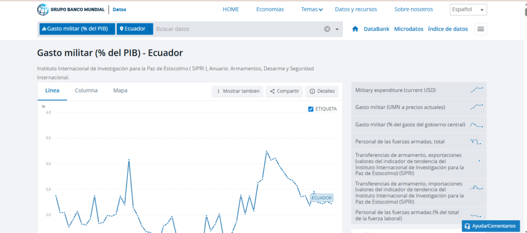 • Banco Mundial: https://data.worldbank.org/indicator/MS.MIL.XPND.GD.ZS?locations=EC