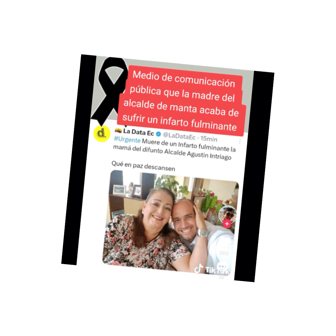 Tras el homicidio del alcalde de Manta, Agustín Intriago, se publicó un post en redes sociales que afirmaba que su madre también falleció a causa de un infarto, provocado por el impacto de la trágica noticia. Calificamos este contenido como falso. Periodistas de medios televisivos de Manta que cubrieron este tema confirmaron a Ecuador Chequea que la madre de Intriago sigue con vida.