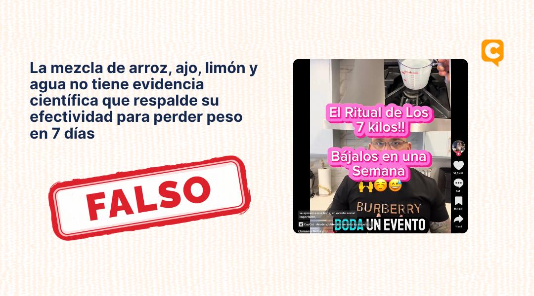 Un video en TikTok, asegura que una mezcla de arroz, ajo, limón y agua, ingerida durante siete días consecutivos, “elimina grasa” y “reduce hasta siete kilos”. El contenido no cita ninguna fuente médica o científica y se presenta como remedio natural comprobado.