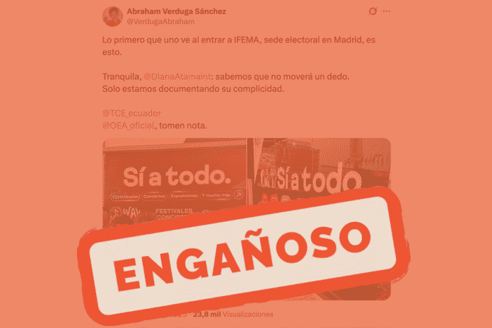Una publicación en X denunció propaganda electoral en IFEMA, sede de votación en Madrid. La pancarta existe, pero forma parte de una campaña institucional del recinto, no del proceso electoral ecuatoriano.