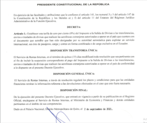 Tras sus primeros 100 días de gestión, Lasso anticipó algunas acciones concretas que adoptará. Aparte de haber enviado la proforma presupuestaria para lo que resta del 2021, ha anunciado que prepara un proyecto de reforma laboral, que eliminará el Impuesto a la Herencia y, a través del Decreto 182, estableció tarifa del 0% del Impuesto a la Salida de Divisas a las transferencias, envíos o traslados de divisas que realicen las aerolíneas extranjeras autorizadas a operar en el país.