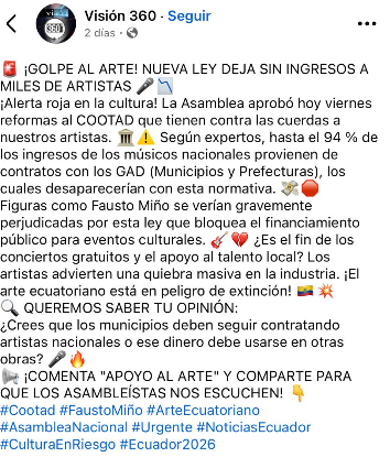 En Facebook circula una publicación que afirma que la nueva “Ley Orgánica Reformatoria al COOTAD para la sostenibilidad y eficiencia del gasto de los Gobiernos Autónomos Descentralizados” dejará sin ingresos a miles de artistas en Ecuador.