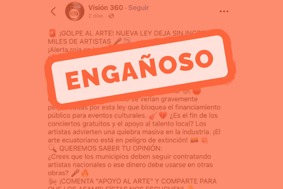 Una publicación en Facebook afirma que la nueva Ley Reformatoria al COOTAD dejará “sin ingresos a miles de artistas”. Sin embargo, el texto aprobado no prohíbe contratar artistas ni elimina los eventos culturales.