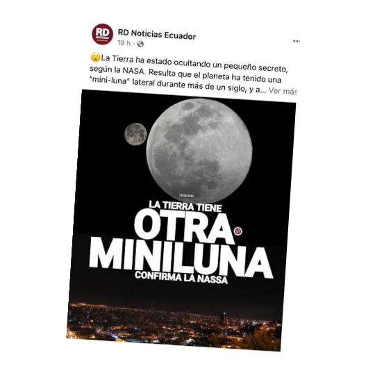 En la red social Facebook circula una imagen que asegura: “La Tierra tiene otra miniluna, confirma la NASA”, está información es imprecisa. La mini luna sólo va a ser temporal, no va a estar para siempre en nuestro planeta; y el estudio fue hecho por científicos, aunque sí fue financiado por la NASA.