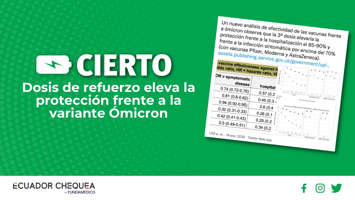 En Twitter se cita el análisis de la Agencia de Seguridad Sanitaria de Reino Unido, publicado en el informe que analiza las variantes del SARS-CoV-2 y las vacunas. Se incluyeron 760.647 casos de la variante Ómicron.
