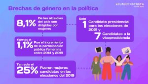 La directora del Centro de Innovación Disruptive recuerda, por ejemplo, que desde la Constitución de 2008, se ofrecieron garantías para que las mujeres desarrollen los procesos políticos con cierta libertad. No obstante, los datos de esta organización demuestran que la mujer todavía es relegada de las funciones públicas y políticas del país: