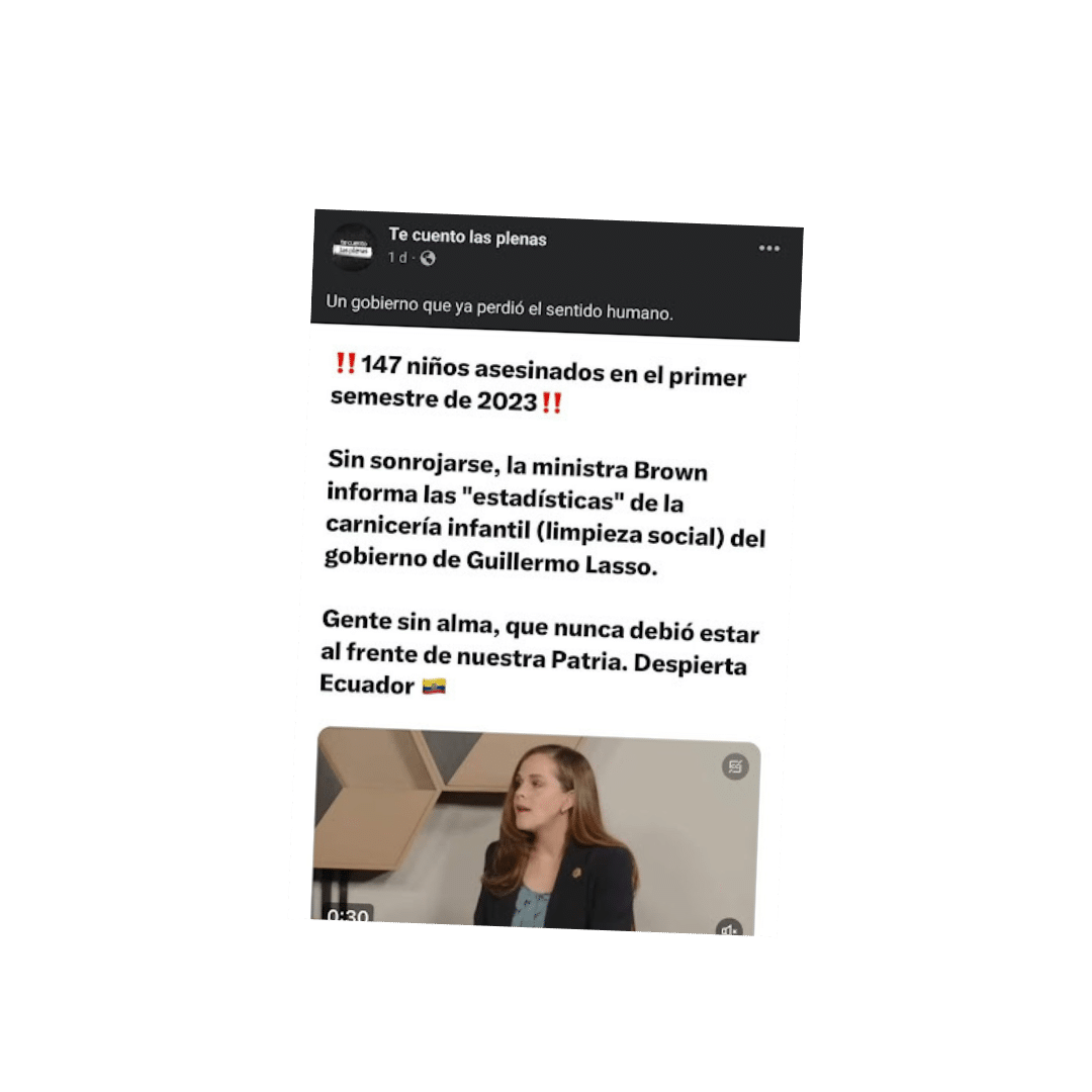 La publicación hace referencia a una publicación realizada en ‘X’ (antes Twitter). Allí se presenta un clip de Brown en el que, la ministra asegura que entre enero y junio de 2023 se han asesinado a 147 niños y niñas por casos de sicariato y homicidios en Ecuador.
