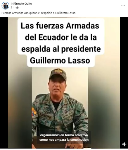 En el cuarto día de manifestaciones contra el Gobierno del presidente, Guillermo Lasso, varios sectores se han sumado a la convocatoria de la Conaie. En redes sociales la disputa se intensificó. Se viralizó un video en el que supuestamente un miembro de las Fuerzas Armadas se dirige al Presidente exigiendo que se responda las necesidades de los manifestantes. Caso contrario, sugiere, los militares saldrán a las calles. La información es falsa. Las Fuerzas Armadas señalaron que se trata de un militar retirado y que no habla en nombre de la institución.