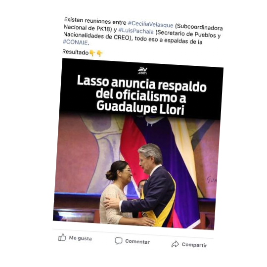 La presidenta de la Asamblea, Guadalupe Llori, corre peligro de ser cesada en su puesto, tras el informe de la Comisión Multipartidista. De hecho, el tema se está tratando esta misma noche en la Asamblea Nacional. Con esta información, una página de Facebook publicó que la subcoordinadora del movimiento Pachakutik, Cecilia Velasque, se ha reunido con el secretario de Pueblos y Nacionalidades, Luis Pachala, lo que ha generado que el oficialismo respalde a Llori. La información es engañosa. Velasque y Pachala negaron que se hayan reunido, pero Lasso sí ha declarado su respaldo a Llori.