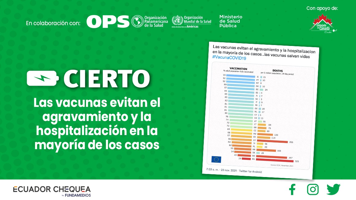 Un contenido publicado en Twitter asegura que las vacunas evitan el agravamiento y la hospitalización en la mayoría de los casos. Además, se enfatiza que las vacunas salvan vidas. La información es cierta.
