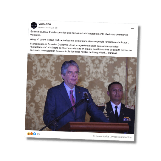 En el sector de Conocoto, en el suroriente de Quito, un hombre y una mujer fueron víctimas de sicariato. Según indicios de la Policía, hubo una persecución, pero luego el hombre de 46 años perdió el control de su auto Renault rojo y chocó. Fue ahí cuando dos hombres se bajaron del vehículo que perseguía a la pareja y los asesinaron. Mientras esto sucede en las calles, una página de Facebook publicó que el presidente, Guillermo Lasso, dijo que se ha reducido notablemente el número de muertes violentas en el país. La información es imprecisa. Lasso, en efecto, afirmó esto durante la ceremonia de posesión de la nueva cúpula militar y policial. Sin embargo, no ofreció las cifras que confirmen su afirmación, ni las autoridades han entregado evidencia a Ecuador Chequea de que esto sea cierto.