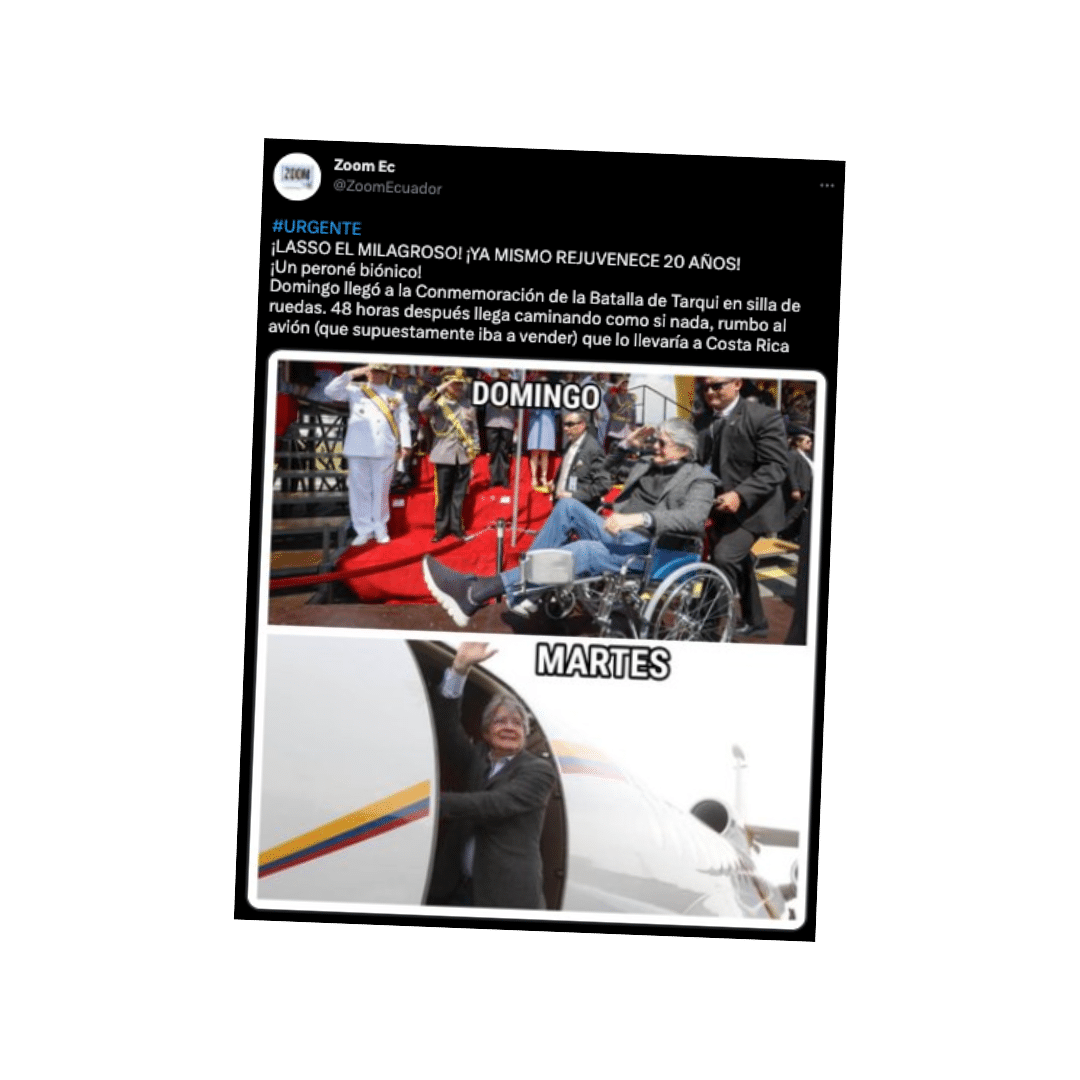 Sin embargo, en la publicación se asegura que ayer Lasso ya se movilizó al aeropuerto para viajar a Costa Rica. A esta información le acompaña una foto donde se ve a Lasso saludar, aparentemente parado, antes de subir al avión.