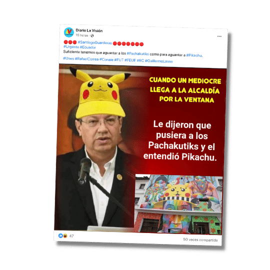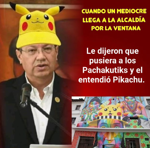 Una publicación en Facebook se refiere, en tono satírico y hasta burlesco, al alcalde de Quito, Santiago Guarderas y señalan que un mural que se pintó en la capital había sido porque se le había pedido al Alcalde que pusiera a Pachakutik (partido miembro del movimiento indígena) y él entendió que le dijeron Pikachu (un personaje de la serie animada Pokemón). Calificamos este post como una sátira, y se publica a propósito de las críticas que se dieron contra el Municipio de Quito tras la entrega de este mural pintado por un artista español.
