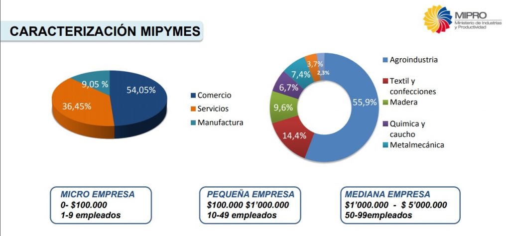 De acuerdo con el Ministerio de Industrias y Productividad, las MIPYMES (micro, pequeña y mediana empresas) constituyen el 95% del tejido empresarial. Conforme a Industrias, las micro se caracterizan por generar ingresos menores a USD 100.000; las pequeñas generan ventas de entre USD 100.001 y USD 1.000.000; y las medianas entre USD 1.000.001 y USD 5.000.000.