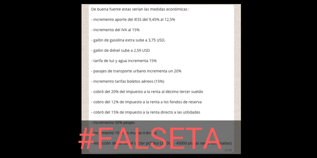La ministra de Economía y Finanzas, María Elsa Viteri, entregó este viernes 29 de marzo el Plan Económico al presidente Lenín Moreno. Este lunes 2 de abril, en el espacio #ElPresidenteInforma, se dará a conocer a la ciudadanía las medidas que se llevarán a cabo. Sin embargo, a través de redes sociales y WhatsApp se difunden supuestas medidas que no corresponden a la realidad.