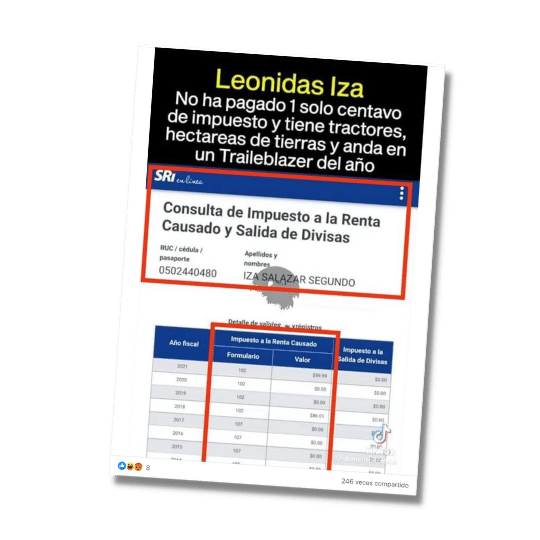 Desde el 27 de junio del 2021, Leonidas Iza es presidente de la Confederación de Nacionalidades Indígenas (Conaie). Iza y Jaime Vargas lideraron las manifestaciones de octubre del 2019 contra el Gobierno de Lenín Moreno. Un usuario en Facebook publicó que el dirigente indígena no ha pagado “un solo centavo de impuesto” y tiene tractores y tierras. Se adjunta una imagen del SRI. Esto es engañoso. Iza sí ha pagado Impuesto a la Renta en cuatro años. Sin embargo, la mayor parte de años registra un impuesto generado de 0.