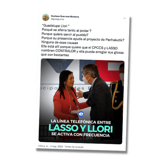 En varias ocasiones el presidente, Guillermo Lasso, ha hablado a favor de la presidenta de la Asamblea Nacional, Guadalupe Llori. Con esta información, un usuario de Twitter publicó una fotografía que asegura que Lasso y Llori mantienen una línea telefónica activa. Además, el post genera preguntas sobre la cabeza del Legislativo y su permanencia en el poder. La información es engañosa. Las declaraciones datan del 2 de diciembre de 2021, no son recientes.