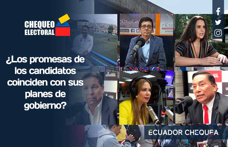 Ecuador Chequea y el Observatorio de Medios del Ecuador (OME) resumen en infografías interactivas una comparación entre los principales ejes de trabajo de los aspirantes a la Alcaldía de Quito, Guayaquil y Cuenca en sus planes de gobierno y las promesas que difunden ante el público.