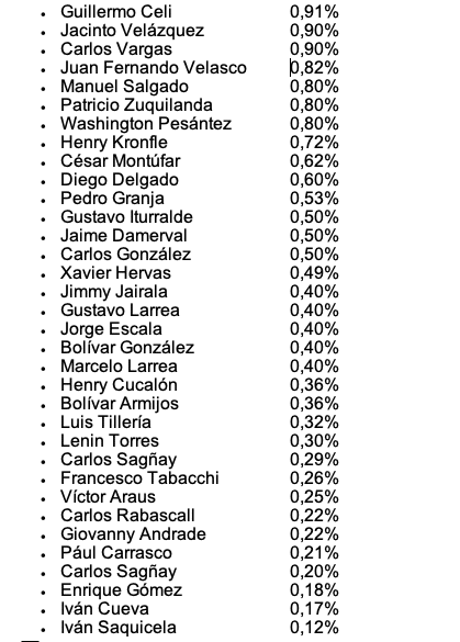 2025. De nuevo el elector tuvo una papeleta abultada, con 16 candidatos. Pero 12 de ellos no llegaron ni al 1% de la votación. Se trata de Henry Kronfle, del Partido Social Cristiano, con el 0,72%; Pedro Granja, del Partido Socialista, con el 0,53%; Jimmy Jairala, de Centro Democrático, con el 0,40%; Jorge Escala, de Unidad Popular, con el 0,39%; Henry Cucalón, de Construye, con el 0,36%; Luis Tillería, de Avanza, con el 0,32%; Francesco Tabacchi, de CREO, con el 0,26%; Víctor Araus, del PID, con el 0,25%; Carlos Rabascall, de la Izquierda Democrática,con el 0,22%; Enríque Gómez, por SUMA, con el 0,18%; Juan Iván Cueva, del Movimiento AMIGO, con el 0,17; e Iván Saquicela, de Democracia SÍ, con el 0,12% que lo ubica como el candidato peor votado desde 1978.