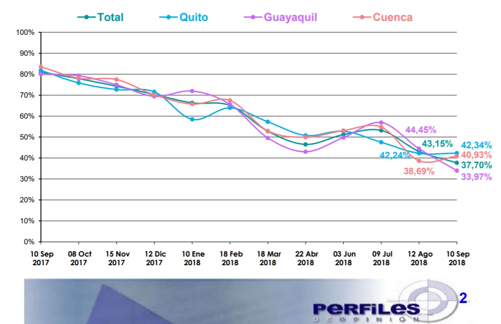 Según Perfiles de opinión, en septiembre de 2017 la aceptación de la gestión de Moreno, en Quito, Guayaquil y Cuenca fue del 80%. Un año después se desplomó a 42,34% (Quito), 33,97% (Guayaquil) y 40.93% (Cuenca) respectivamente.