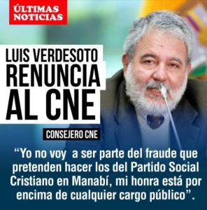 En Facebook unapublicación de una cuenta personal asegura que el exconsejero Luis Verdesoto renunció al Consejo Nacional Electoral (CNE). El contenido atribuye una supuesta cita a Verdesoto que dice: “Yo no voy a ser parte del fraude que pretenden hacer los del partido Social Cristiano en Manabí, mi honra está por encima de cualquier cargo público”. Verdesoto sí renunció, pero aquella frase no fue dicha por él ni corresponde a la razón para que el exconsejero haya dejado su cargo.
