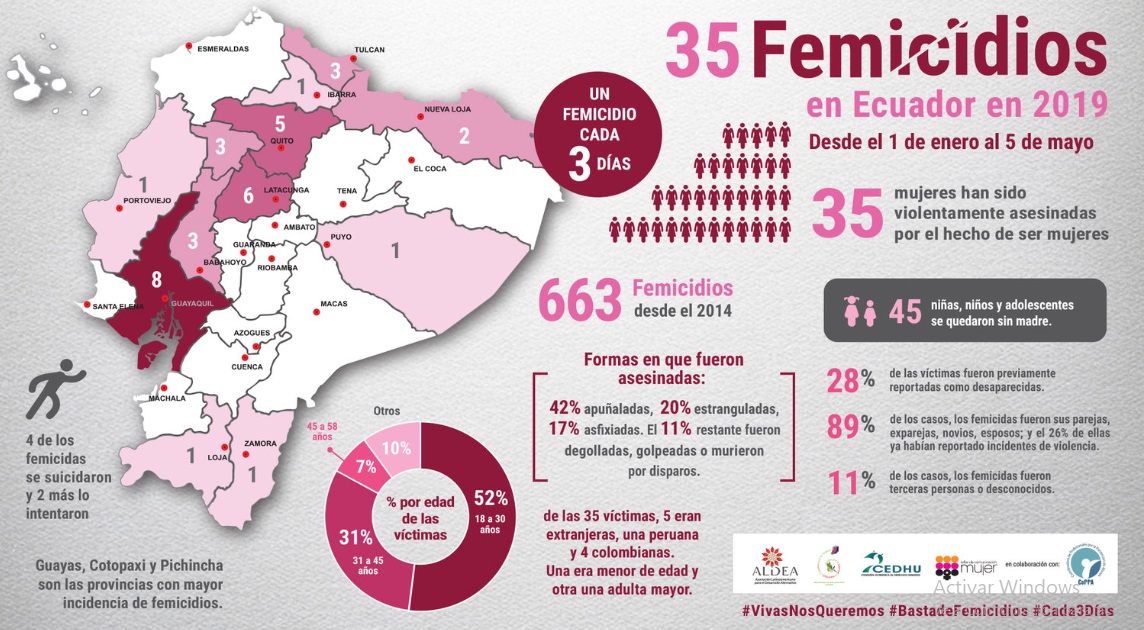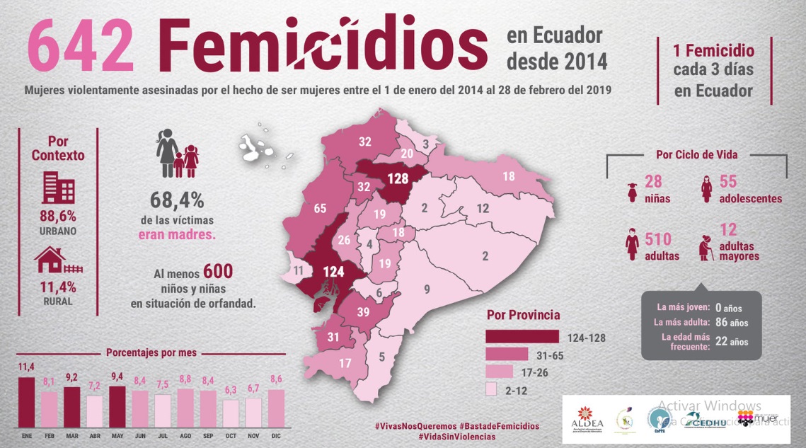 Por su parte, la Asociación Latinoamericana para el Desarrollo Alternativo elabora un mapeo todos los años acerca de la situación del femicidio en el país. En su mapa del periodo 2014-2019, se muestran datos sobre este delito. Por ejemplo, el 88,6% de los delitos se ha dado en un contexto urbano, mientras que el 11,4% corresponde al contexto rural. O que el cometimiento de esta falta se ha dado en su mayoría en las provincias de Guayas y Pichincha. Sin embargo, resalta que “642 mujeres han sido asesinadas por el hecho de ser mujeres entre el 1 de enero de 2014 y el 28 de febrero de 2019”.